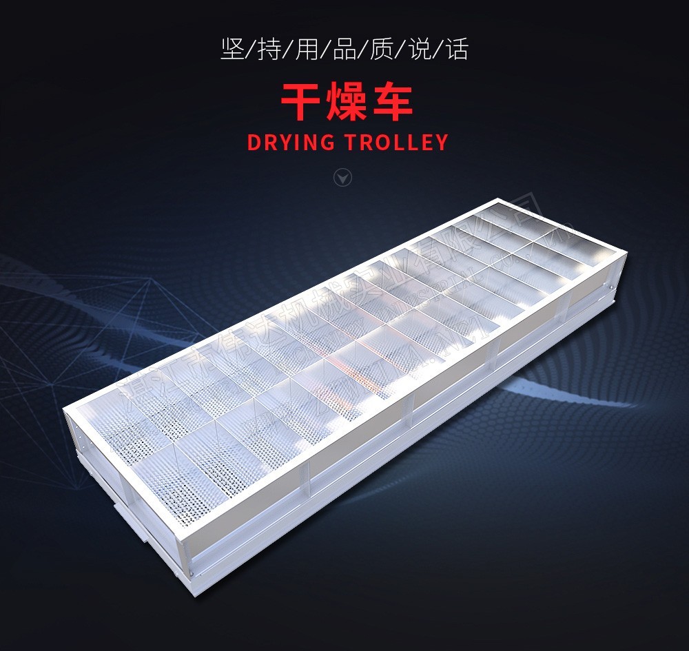 La colle en granulés tombe du dispositif d’alimentation dans les cases du chariot de séchage à travers le tamis vibrant, où elle est répartie uniformément. Le chariot de séchage est ensuite transporté par le chariot de transfert et le poussoir vers le four de séchage pour y être séché.