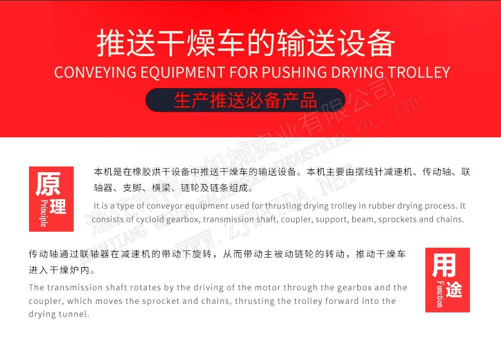 本米乐|米乐·M6(China)官方网站是在橡胶烘干设备中推送干燥车的输送设备。本米乐|米乐·M6(China)官方网站主要由摆线针减速米乐|米乐·M6(China)官方网站、传动轴、联 轴器、支脚、横梁、链轮及链条组成。